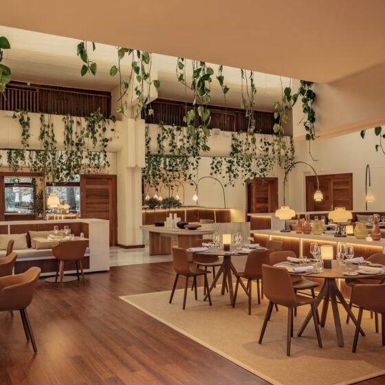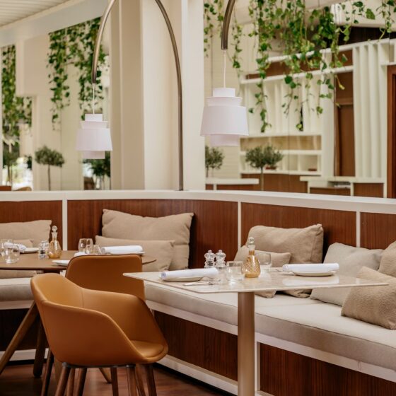 The interior design is characterized by clean lines and elegantly subtle elements, carefully attending to each piece and detail. It creates an atmosphere that balances functionality and sophisticated aesthetics, enhancing the natural and luxurious character of the accommodation and making each visit to the restaurant a unique experience.