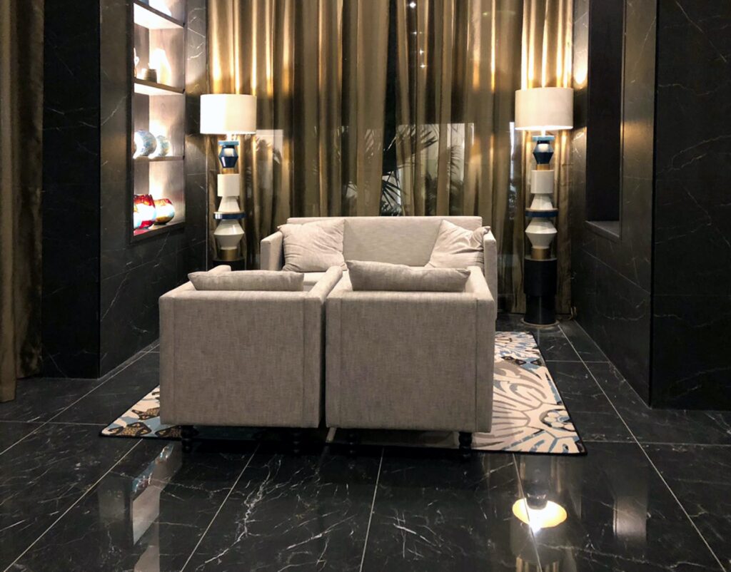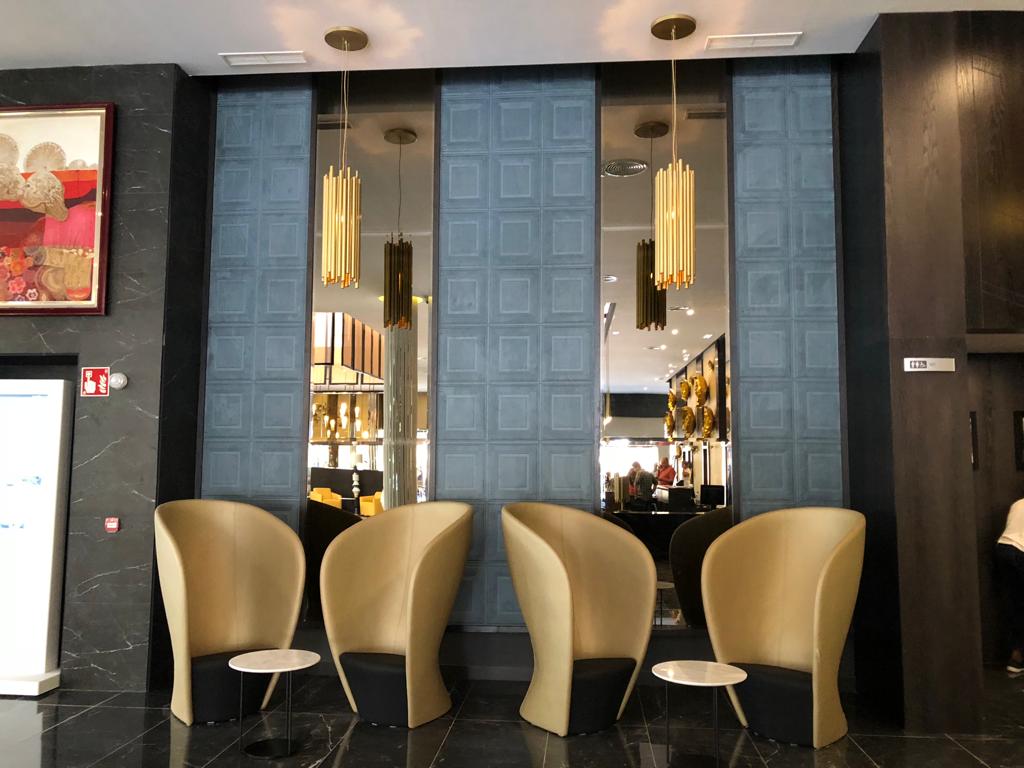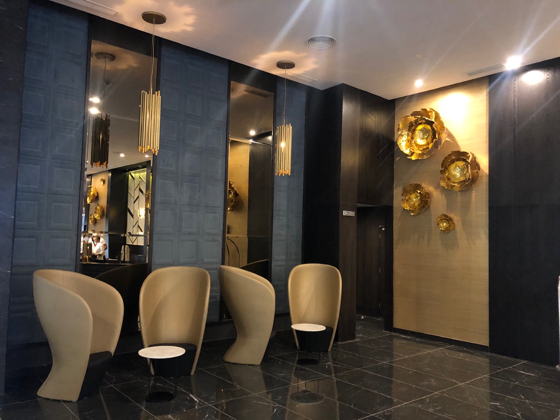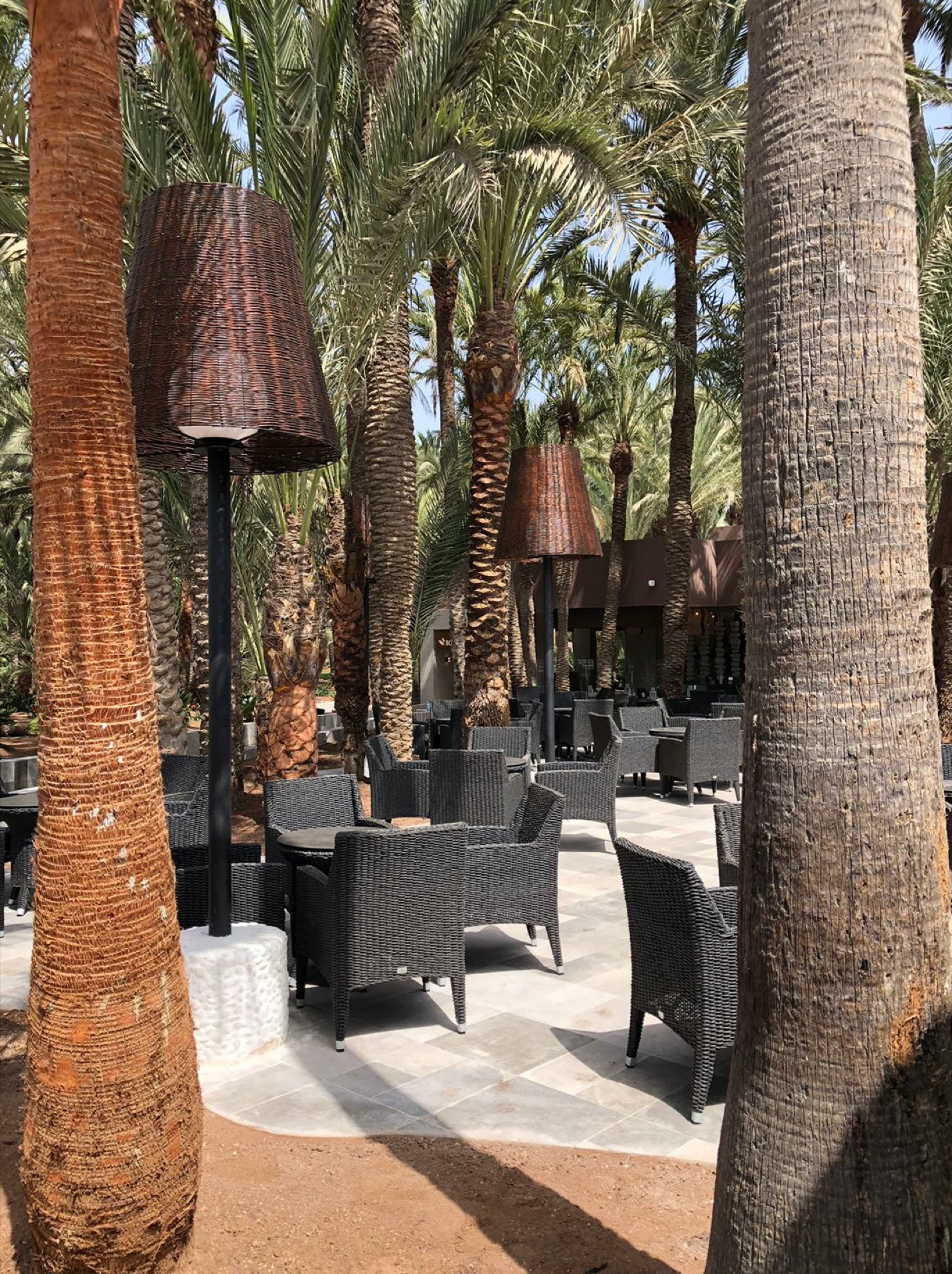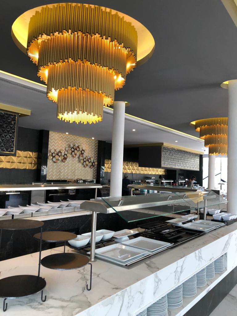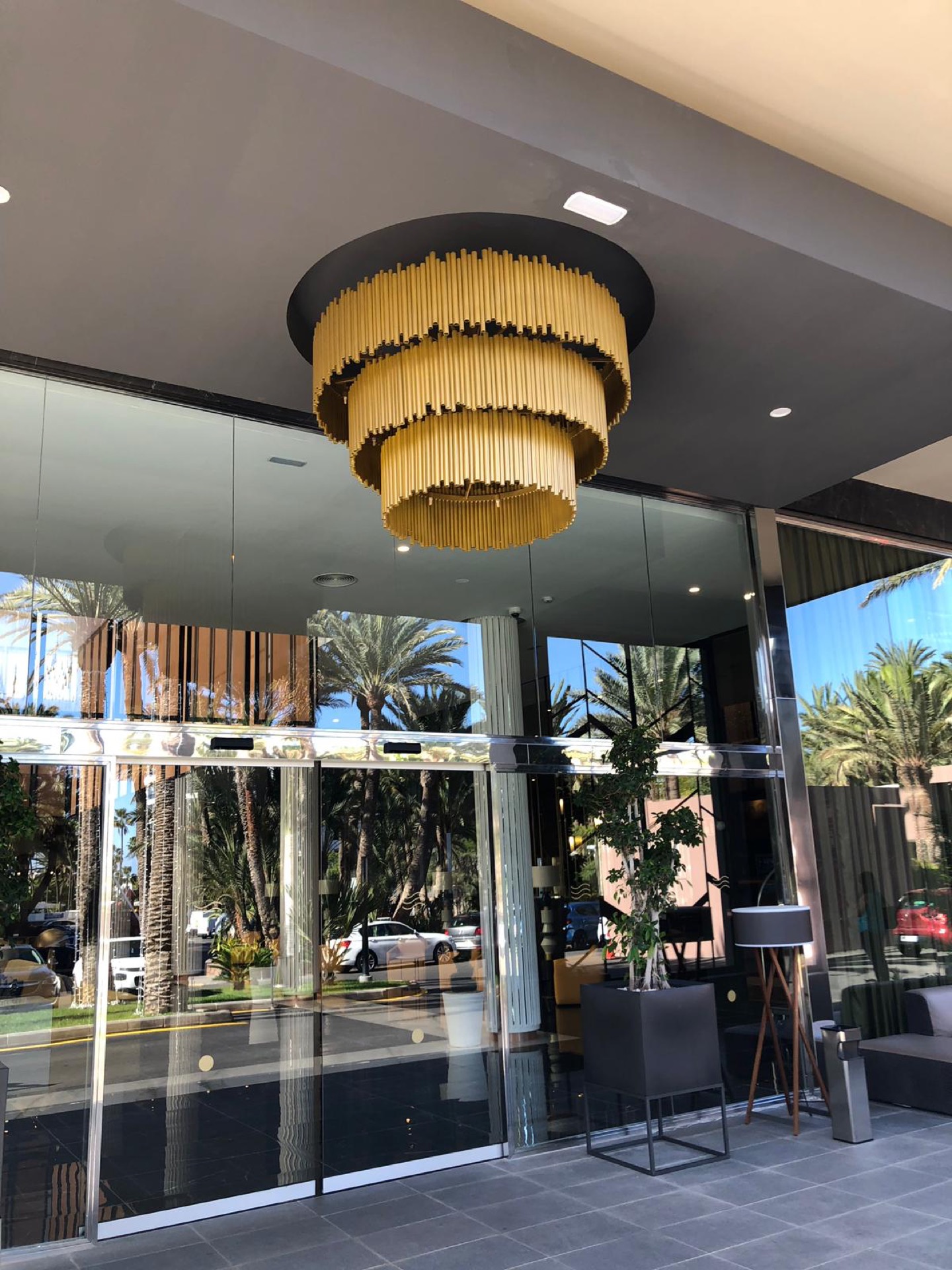 The black of its soil emerged from volcanoes. The golden of its beaches and dunes. The white of its clarity present throughout the year. The inspiration for the design of the Riu Oasis Hotel in Maspalomas was born from the combination of these colors. A mixture in suitable proportions that cover the atmosphere of all its spaces, furniture, and lights. Metals and molded glass to create large chandeliers, domes, and angled baskets to house the light and enhance it through its reflections. A hotel culminated with rooms in noble materials and lighten up by their views of the Atlantic Ocean and metal wall lights and folded fabric lampshades.