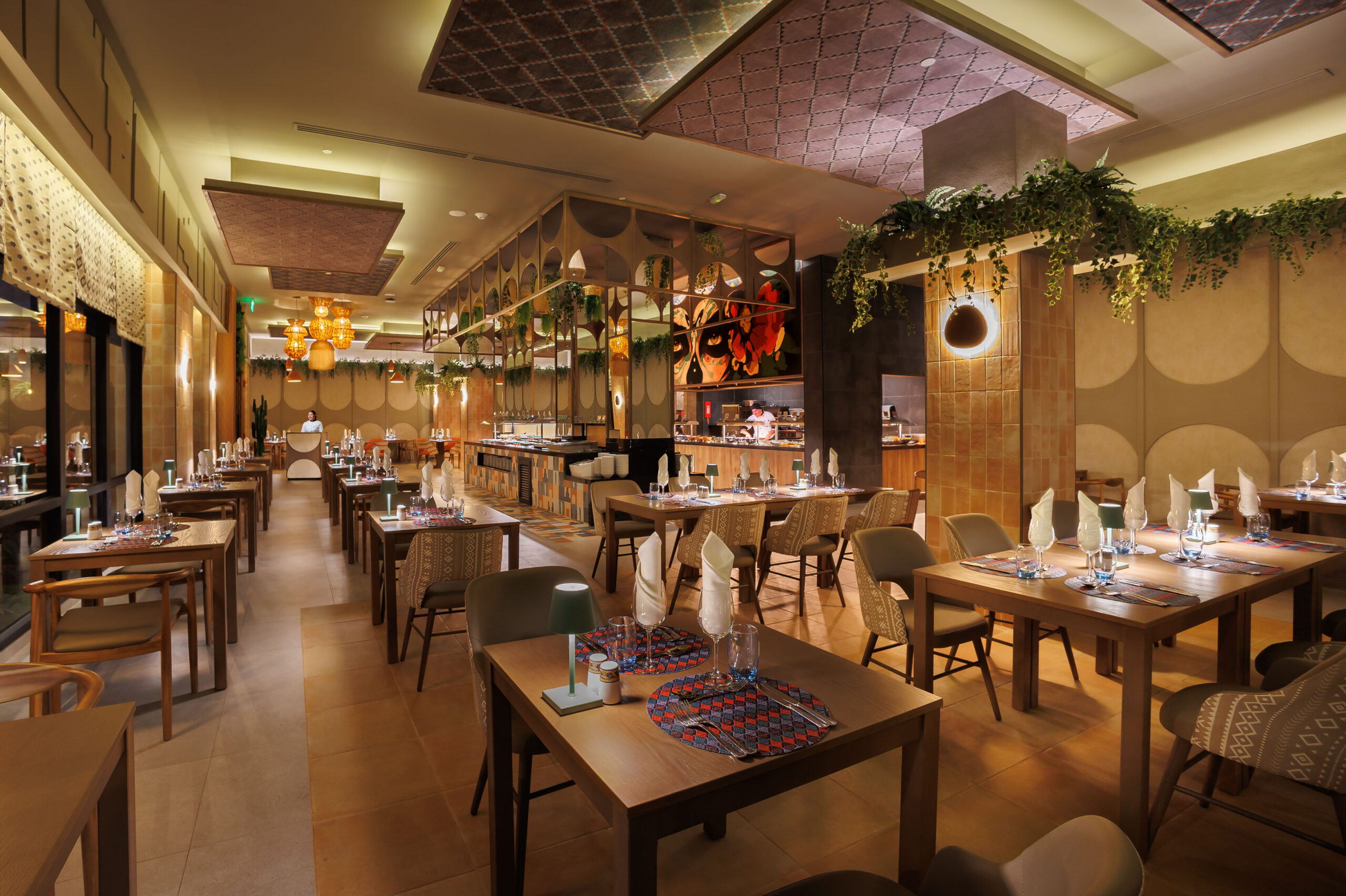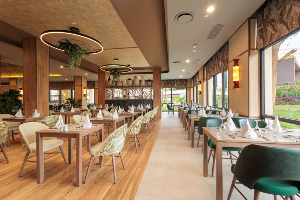 El diseño de cada lámpara ha sido concebido para integrarse con el estilo tropical del hotel, realzando la arquitectura y el interiorismo del conjunto. El resultado es una atmósfera envolvente y sofisticada que acompaña la esencia del Riu Guanacaste, haciendo de cada comida un momento especial.